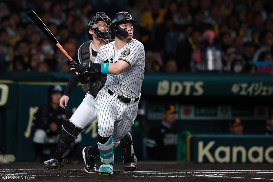 好調の佐藤輝が難敵・モイネロのカーブを鋭く弾き返す。